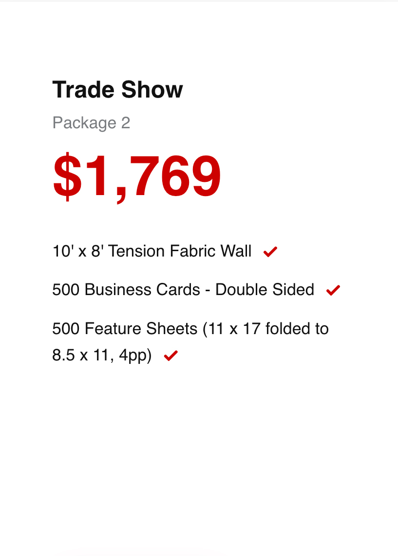 HomeTrade Show PrintingTrade Show Printing (Package 2) Trade Show Printing (Package 2)$1,769.00 10′ x 8′ Tension Fabric Wall 500 Business Cards – Double Sided 500 Feature Sheets (11 x 17 folded to 8.5 x 11, 4pp) Trade Show Printing (Package 2) quantity Buy now Category: Trade Show Printing Product ID: 25288 Related products Trade Show Printing (Package 1) $719.00 Buy now Trade Show Printing (Package 3) $2,169.00 Buy now